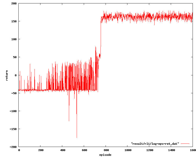 In OUT_DIR (result/rl1), the result files are stored. For example, use gnuplot to plot the learning curve as: