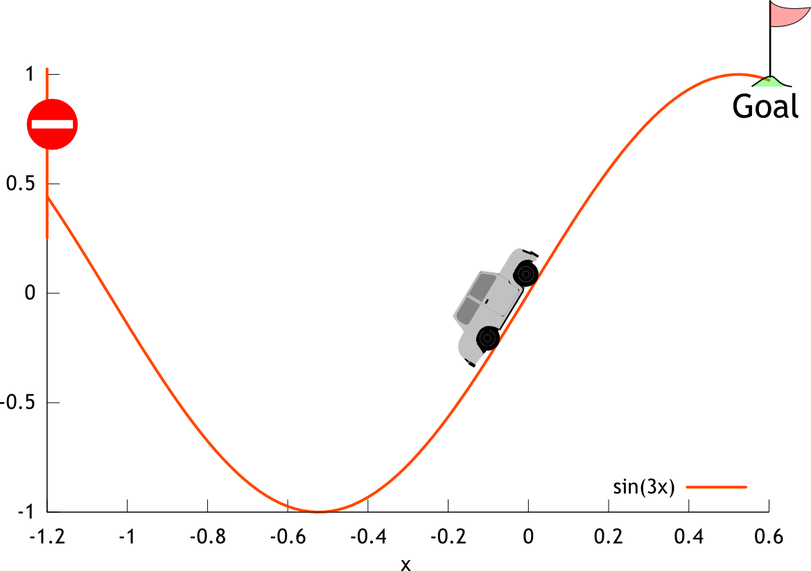The objective of this task is to go from the start (x=-0.5) to the goal (x>=0.6). The car can accelerate, but does not have enough power to go beyond the mountain. Thus, the car needs to climb the opposite side, then climb toward the goal by using the kickback.