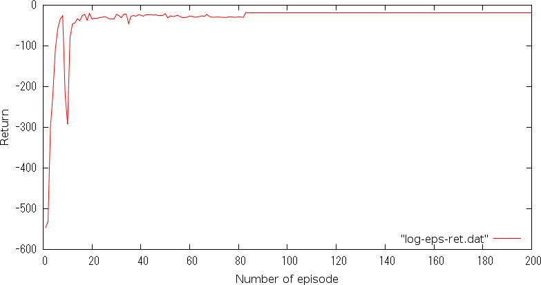 In order to store the learning logs, make a directory result/rl1 which is specified with -outdir option. Plotting log-eps-ret.dat, you will obtain a learning curve: